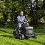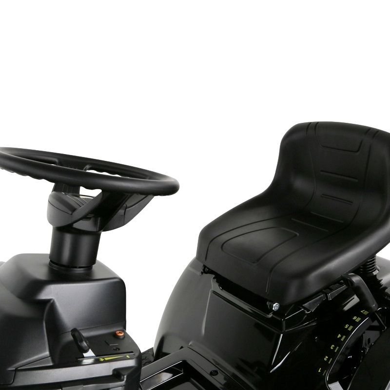 - Ruedas delanteras y traseras de diferentes tamaños, con banda de rodadura ancha que le permite trabajar en terrenos irregulares y desiguales y moverse fácilmente cerca de obstáculos, plantas y muebles de jardín.